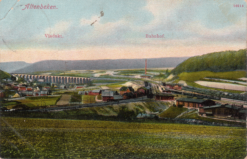 Vorn links ist die von Warburg kommende Strecke zu sehen, rechts die Strecke nach Langeland, die kurz hinter dem Bahnhof in den Rehberg-Tunnel mündet. Vorn rechts ein Teil des Bahnbetriebswerks. Links ist der die Strecke nach Paderborn führende am 21.07.1853 eröffnete Viadukt, das Wahrzeichen Altenbekens, bei der Kolorierung der Fotografie nochmal deutlich hervorgehoben worden. Der Poststempel datiert vom 23.02.1909. |