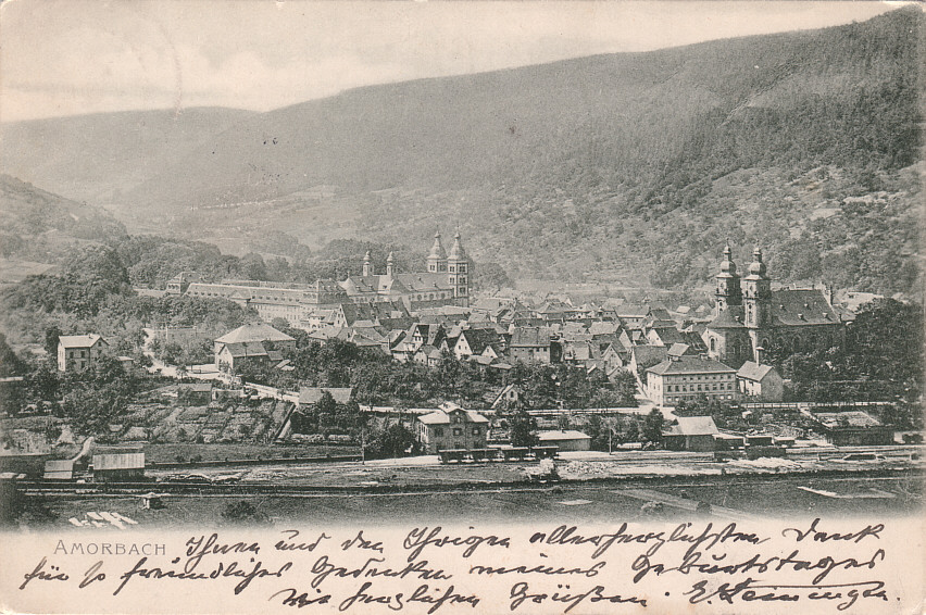 Kloster und Pfarrkirche beherrschen die Silhouette des Ortes Amorbach im Odenwald. Im Vordergrund ist der am 15.04.1880 eröffnete Bahnhof mit einigen abgestellten Waggons zu sehen. Am 19.01.1904 wurde diese Karte mit der Post verschickt. |