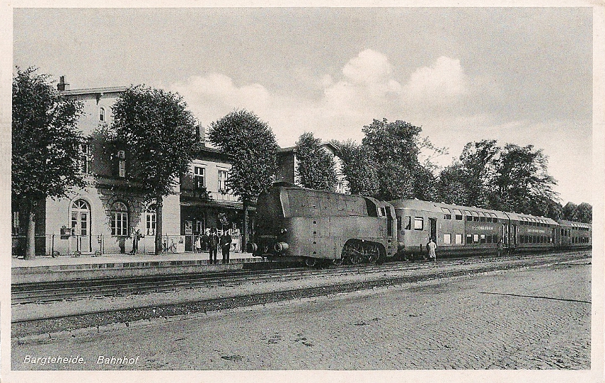 Ab Sommer 1936 setzte die LBE neue Maßstäbe im Berufs- und Ausflugsverkehr mit dem Einsatz von Wendezügen mit Doppelstockwagen und stromlinienverkleideten Lokomotiven. Auf ihre neuen Züge waren die Eisenbahner der LBE sichtlich stolz, weswegen sie sich im Bahnhof Bargteheide wohl gern mit einem der Züge ablichten ließen.