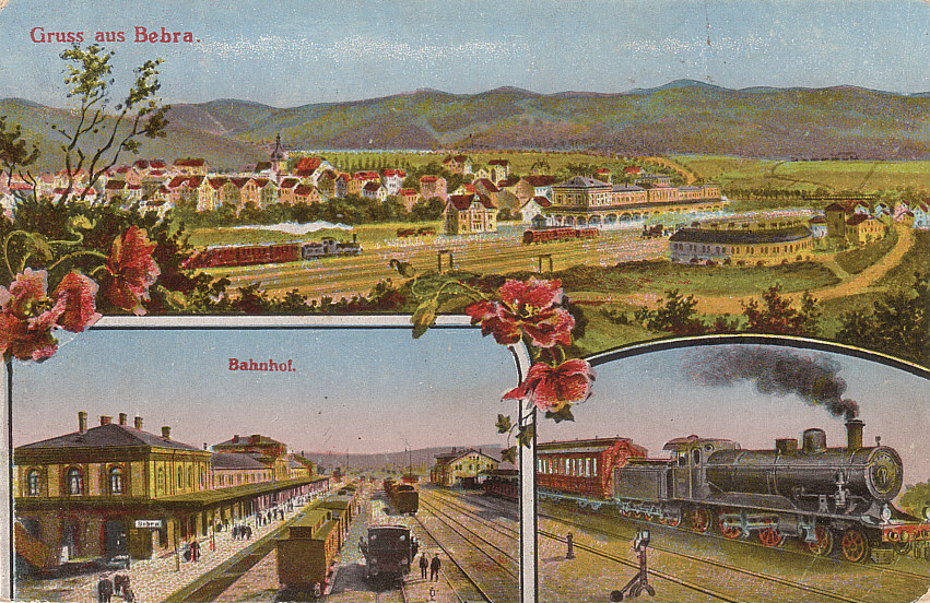 Die am 15.10.1848 eröffnete Strecke Bebra - Guxhagen war die Keimzelle, aus der nach und nach der Eisenbahn-Knotenpunkt Bebra entstand. Die beiderseitige Verlängerung der Strecke nach Haueda bzw. Gerstungen erfolgte bereits am 29.08.1849. Erst mit der Eröffnung der Strecke Bebra - Fulda am 01.10.1866 wurde jedoch die Entwicklung zum wichtigen Knotenbahnhof eingeleitet. Das 1869 errichtete Empfangsgebäude wurde in der Folgezeit ständig erweitert. Von den Ansichten auf dieser Postkarte handelt es sich lediglich bei der unteren linken um eine kolorierte Fotografie. Das obere Bild gibt einen recht brauchbaren Überblick über das gewaltige Ausmaß des Bahngeländes im Vergleich zum Städtchen Bebra, wenngleich die künstlerische Freiheit des Malenden durchaus genutzt wurde. Bei der etwas ungelenk wirkenden Zeichnung der Dampflokomotive unten rechts hat sich der Kunstschaffende von verschiedenen Bauarten der |