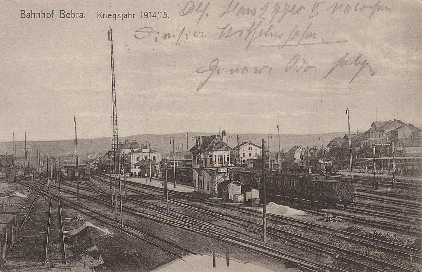 Der Bahnhof Bebra war seit seiner Eröffnung am 15.10.1848 nach und nach zu einem wichtigen Eisenbahn-Knotenpunkt mitten in Deutschland geworden. Entsprechend bedeutsam war er für die vielfältigen Transportaufgaben, die das Deutsche Heer den Eisenbahnen während des Ersten Weltkriegs aufbürdete. Der Lauf unzähliger Militärzüge berührte den Bahnhof Bebra in jenen vier Jahren.