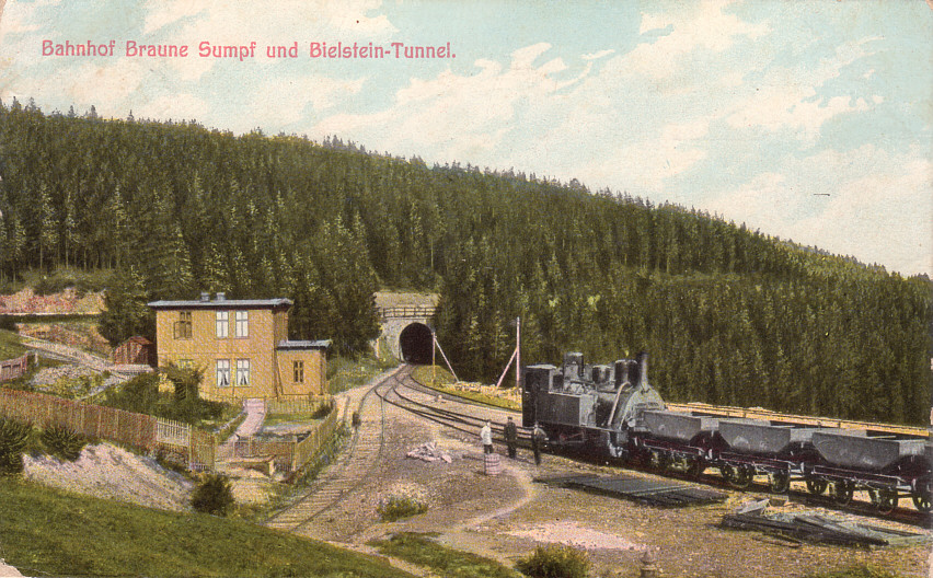 Am 01.11.1885 wurde die Strecke Blankenburg (Harz) – Rübeland eröffnet. Sie wurde im gemischten Der Tunnel war bereits am 03.07.1875 als Teil einer Erzstufenbahn – der Schurrenbahn – zum Abtransport des hier gewonnenen Eisenerzes ins Tal nach Blankenburg in Betrieb genommen worden. Er wurde für die Rübelandbahn im Profil erweitert. 1965 wurde er schließlich im Rahmen der Elektrifizierung der Strecke zugeschüttet und durch einen versetzt gelegenen Einschnitt ersetzt. Diese Karte wurde am 12.05.1911 von einem Harz-Urlauber nach Meissen verschickt. Auf der Rückseite trägt sie noch den Aufdruck: "Harz‑Zahnrad‑Bahn Blankenburg – Rübeland – Tanne Offizielle Ansichtskarte Nr. 5" Ein anderes, bereits 1906 gelaufenes Exemplar einer solchen Karte ist bekannt. |