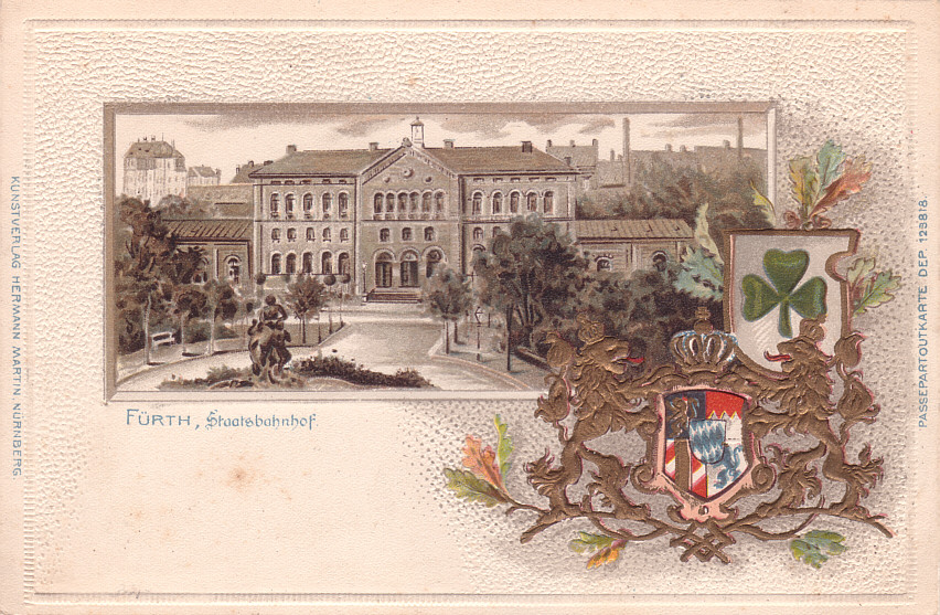 Erst 1865 wurde der hier gezeigte Staatsbahnhof erbaut und dem Verkehr übergeben. Bei der Abbildung handelt sich um eine Zeichnung. Dabei ist stets zu bedenken, dass die künstlerische Freiheit gern genutzt wurde, Gebäude imposanter erscheinen zu lassen, als sie tatsächlich sind. Der Vergleich mit einer Fotografie des Bahnhofs zeigte mir aber, dass hier lediglich ein ganz klein wenig in die Höhe geschummelt wurde - letzten Endes tut das der Bildinformation keinen Abbruch. Auch handelt es sich bei dieser Karte um eine wunderschön goldfarben verzierte Reliefkarte, was an sich schon wert ist, sie hier zu zeigen.