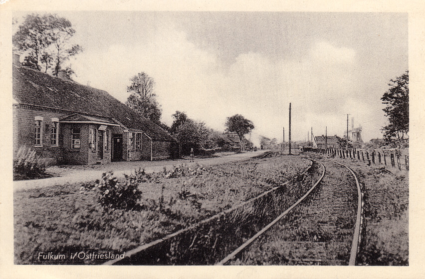 Die 81 Kilometer lange Strecke Emden - Norden - Esens - Jever wurde am 14.06.1883 eröffnet. Zwischen Dornum und Esens liegt Fulkum, nach dem Amtlichen Bahnhofverzeichnis von 1938 ein Bahnhof Vierter Klasse mit beschränktem Güterverkehr und ohne Rampe. Der Bahnhof lag direkt an der Straße. Der letzte Personenzug verkehrte hier am 28.05.1983. |