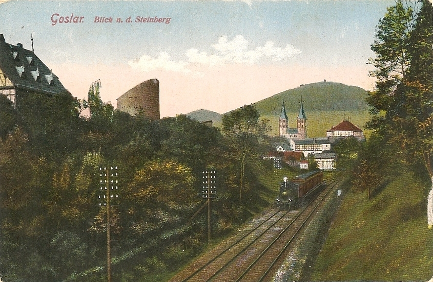 Dieser Zug verlässt Goslar in Richtung Oker und passiert hierbei den Teufelsturm. Bereits hinter sich gelassen hat er nicht nur den hinter der Kurve gelegenen Bahnof Goslar, sondern auch die Neuwerkkirche und das auffällige Hotel "Der Achtermann". Ganz im Hintergrund erhebt sich der Steinberg mit seinem Aussichtsturm.