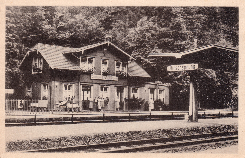Auf unserer Ansichtskarte sehen wir zwei Bahnsteiggleise und die "Bahnhofwirtschaft Hirschsprung". Ein Vermerk auf der Rückseite erklärt E. Hauser zum Inhaber des Etablissements.