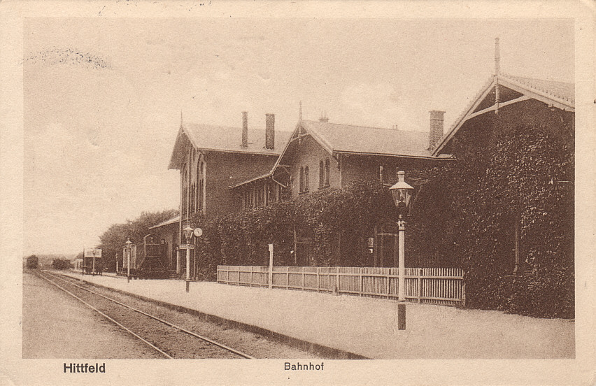 Erst nach langwierigen Bauarbeiten konnte die Köln-Mindener Eisenbahngesellschaft am 01.04.1874 ihre Eisenbahnverbindung zwischen Harburg (Elbe) und Bremen einweihen. Der erste Halt auf dieser Strecke war Hittfeld. Diese Ansichtskarte ist am 09.08.1916 im Bahnpostwagen des Zuges 703 von Hamburg nach Osnabrück befördert worden. |