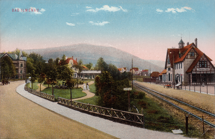 Der Haltepunkt Ilmenau Bad liegt am westlichen Ortsrand von Ilmenau und schließt die Erholungseinrichtungen der kleinen Stadt besser an als der Bahnhof im Zentrum. Die Eröffnung der Strecke Die Karte ist vermutlich bald nach der Eröffnung, also zu Beginn des 20. Jahrhunderts, hergestellt worden. |