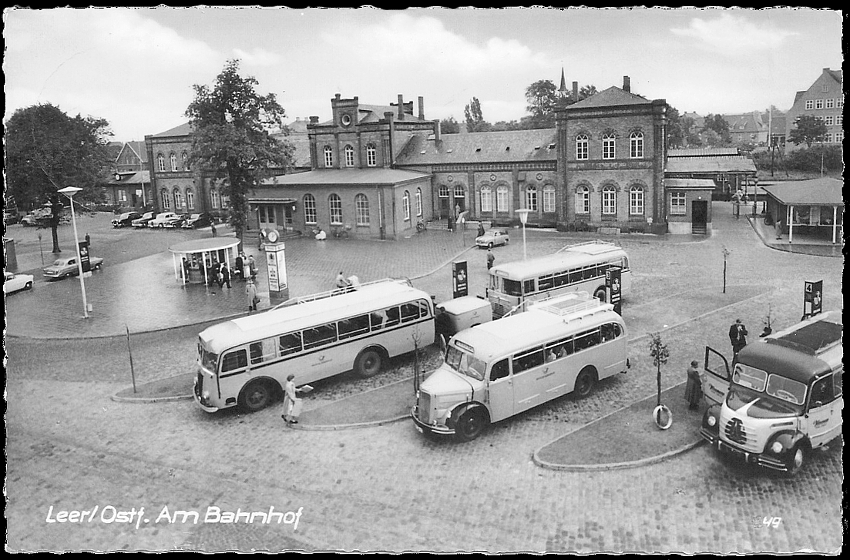 Das Empfangsgebäude sehen wir auf dieser Ansichtskarte aus den 1950er Jahren (Poststempel: 23.06.1961) von der Straßenseite aus. Von hier besorgten Busse den weiteren Verkehr über das flache Land. Vier unterschiedliche Fabrikate, allein drei von der Deutschen Bundespost, sind auf dieser Aufnahme zu sehen. |