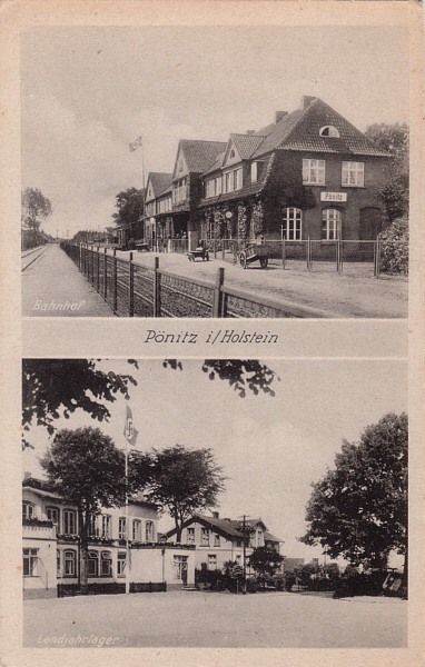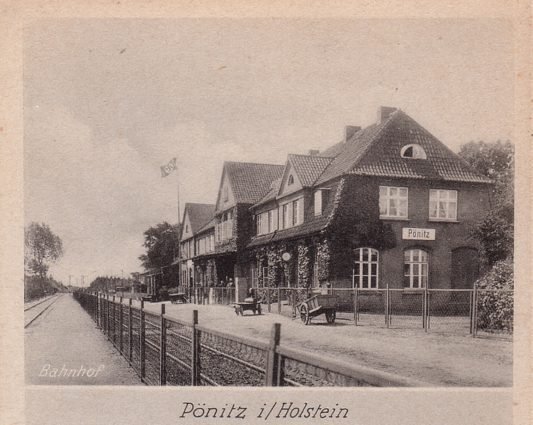 An der am 10.04.1873 eröffneten Eutin - Lübecker Eisenbahn wurde in km 11,56 der Bahnhof Gleschendorf errichtet – gegen den Wunsch der gleichnamigen Gemeinde zwei Kilometer von dieser entfernt, obwohl die Strecke direkt am Ort vorbeiführt. Erst 20 Jahre später wurde dem Wunsch der Gleschendorfer nach besserer Anbindung mit der Anlage eines neuen Haltepunktes "Dorf Gleschendorf" in direkter Ortslage stattgegeben. Rund um den "Bahnhof Gleschendorf" hatte sich inzwischen eine neue Ortschaft recht gut entwickelt. Dazu hatte wohl auch die 1886 erfolgte Eröffnung der Stichstrecke von Bahnhof Gleschendorf nach Ahrensbök beigetragen. 1934 wurde das Empfangsgebäude umgebaut. Am 15. Mai des selben Jahres erfolgte die Umbenennung sowohl der kleinen Ortschaft als auch des Bahnhofs von "Bahnhof Gleschendorf" in "Pönitz". (Der nahegelegene und bis dahin "Pönitz" genannte Ort wurde zu "Pönitz am See".) Neuer Orts- und Bahnhofsname, erneuertes Bahnhofsgebäude, Einrichtung des Landjahrlagers und der Anbruch einer neuen politischen Ära, deren Machthaber sich all dies auf die Fahnen schreiben wollten, waren wohl Anlass genug zur Herausgabe dieser Ansichtskarte, die somit wahrscheinlich den Bahnhof im Zustand Mitte der 1930er‑Jahre zeigt. |