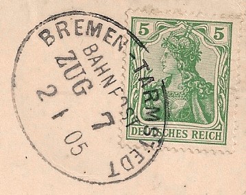 Die hier gezeigte Ansichtskarte aus Tarmstedt fand am 02.01.1905 den Weg nach Bremen im Bahnpostabteil des Zuges 7.