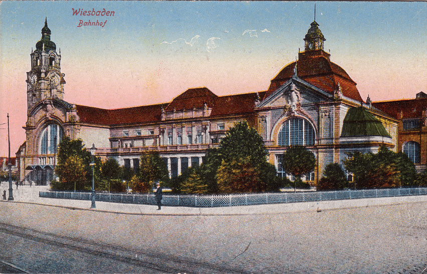 Der Wiesbadener Hauptbahnhof wurde 1906 eröffnet und ersetzte - wie es in vielen anderen größeren Städten gleichfalls geschah - mehrere kleinere, regional ausgerichtete Bahnhöfe. Im Falle Wiesbadens waren es drei zu ersetzende Bahnhöfe. Diese Ansichtskarte wurde am 12.01.1919 verschickt. Sie dürfte allerdings bald nach der Eröffnung des Bahnhofs erschienen sein. |