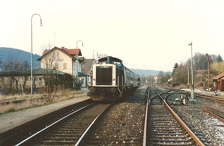 211 035 stand am 30.03.1993 mit dem N 7777/7778 im Bahnhof Ebermannstadt und wartete auf die letzte Fahrt des Tages.