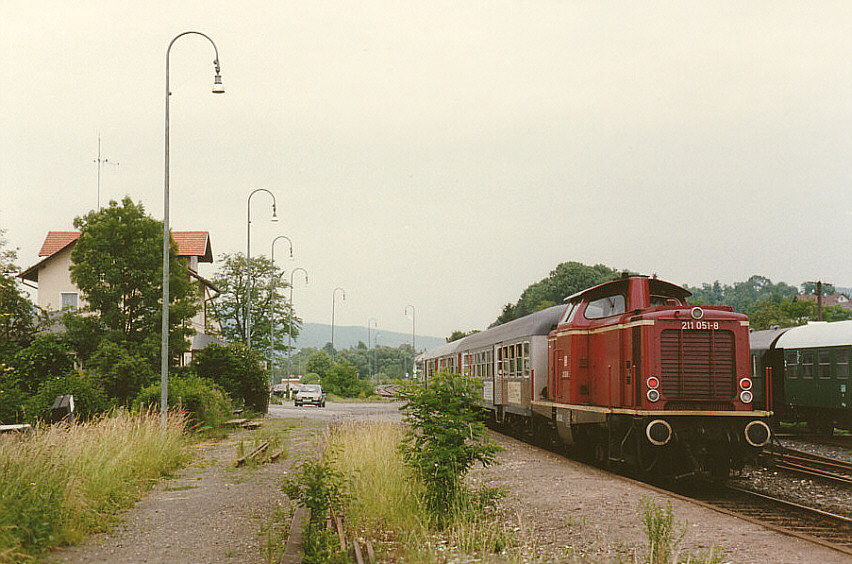Mit N 7765/7768 stand 211 051 am 18.06.1990 im Bahnhof Ebermannstadt. Gleis 1 war nicht lange zuvor abgebaut worden.