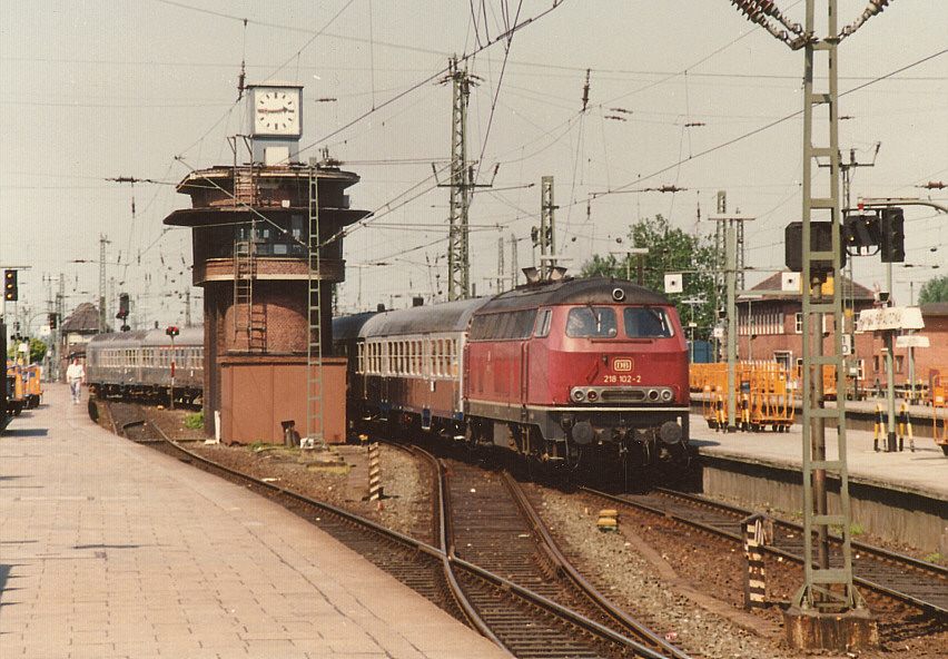 Einfahrt der 218 102 mit einer Garnitur "Silberlinge" in den
