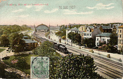 Hier sehen wir den Bahnhof Dammtor von Südosten. Der von einer Schnellzuglokomotive der preußischen Baureihe S 7 geführte Zug befindet sich also auf dem Weg zum (je nach Aufnahmezeitpunkt möglicherweise noch im Bau befindlichen) Hauptbahnhof. Verschickt wurde die Karte jedenfalls am 16.08.1907.